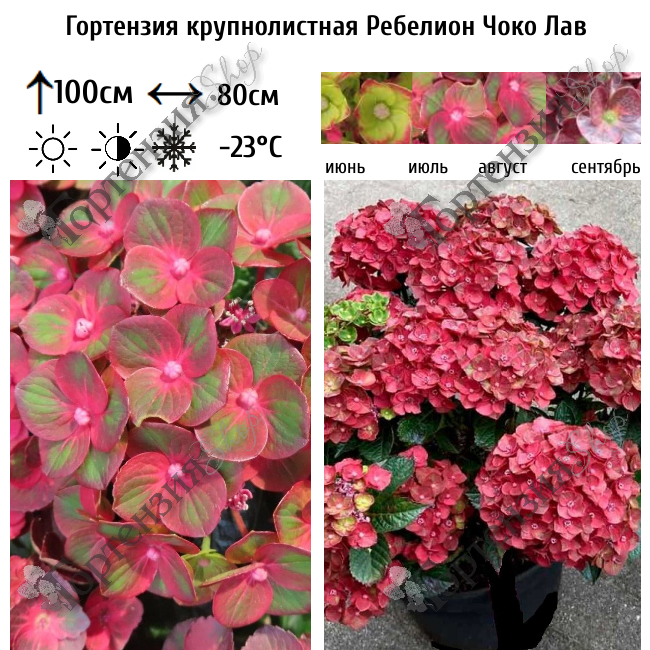 Гортензия крупнолистная «Ребелион Чоко Лав» (Hydrangea macrophylla ‘Rebelion Choco Love’) — листопадный декоративный кустарник высотой и шириной около 1 м с компактным, хорошо ветвящимся кустом; цветёт с июня по сентябрь крупными шаровидными соцветиями диаметром 15–20 см, окраска цветков отличается уникальной изменяющейся палитрой: в начале цветения — насыщенно‑розовые или малиновые оттенки, затем появляются зеленоватые тона, а итоговая окраска зависит от кислотности почвы (на кислых почвах преобладают фиолетово‑бордовые оттенки, на нейтральных — розовые), при этом в пределах одного соцветия наблюдается эффектный градиентный переход оттенков, что создаёт особую декоративную ценность; листья крупные, тёмно‑зелёные, глянцевые, эллиптической формы с зубчатым краем и сохраняют декоративность на протяжении всего сезона. Растение предпочитает полутень или места с утренним солнцем и лёгкой тенью в полуденные часы, растёт на плодородной, рыхлой, хорошо дренированной, умеренно влажной почве со слабокислой реакцией (pH 5,0–6,0), требует регулярного и обильного полива, а также подкормок: весной — азотных удобрений для наращивания зелёной массы, в период бутонизации и цветения — комплексных удобрений с преобладанием фосфора и калия, а специализированные подкормки для гортензий (с микроэлементами) усиливают яркость окраски. Зимостойкость умеренная (зона морозостойкости USDA 6, до −23 °C): в средней полосе и более северных регионах требует надёжного укрытия на зиму, а молодые растения особенно чувствительны к морозам. Уход включает ежегодную формирующую обрезку ранней весной (до начала сокодвижения), удаление старых и повреждённых побегов, мульчирование приствольного круга для сохранения влаги и защиты корней, а также защиту от вредителей (тля, паутинный клещ) и болезней (мучнистая роса, хлороз). В ландшафтном дизайне используется для солитерных посадок на газоне, групповых композиций в миксбордерах, создания живых изгородей средней высоты, оформления придомовых территорий и зон отдыха, хорошо сочетается с хостами, папоротниками, астильбами, рододендронами и подходит для выращивания в крупных контейнерах на террасах и балконах.