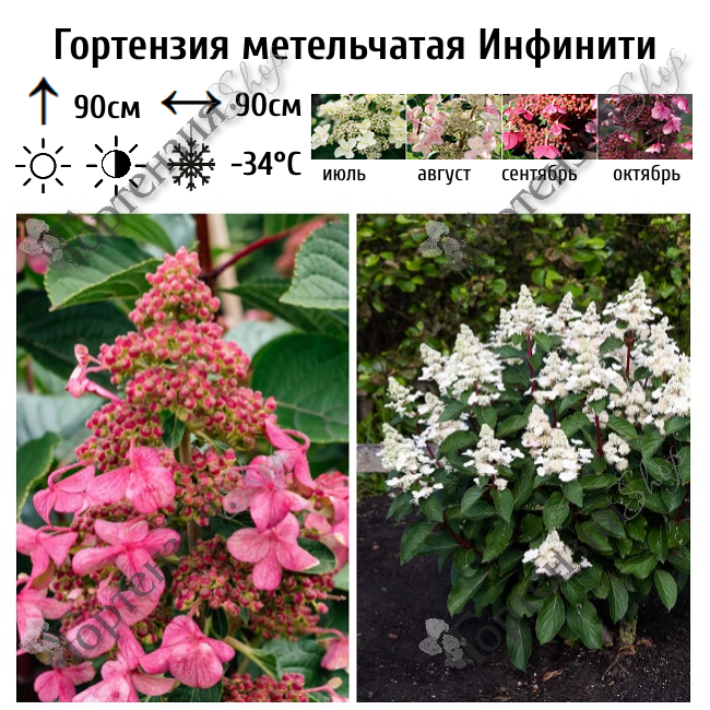 Инфинити (Infinity) - это очень компактная гортензия, с достаточно жесткими и сильными ветвями, которые прекрасно держат куст и он не разваливается.Куст высотой 90 см и до 90 см в ширину.Размер соцветия: 15-20 см. Цветет более 150 дней, и цвет меняется от белого до темно-красного в течение сезона. Соцветие состоит из стерильных и фертильных цветков. Цветет в июле-октябре. Светолюбива, но хорошо растет и в полутени. Зимостойкость высокая, но молодые растения лучше на зиму укрывать. Учитывая невысокий рост, прекрасно смотрится в садах малых форм. Из этого сорта получается роскошная бордюрная изгородь.