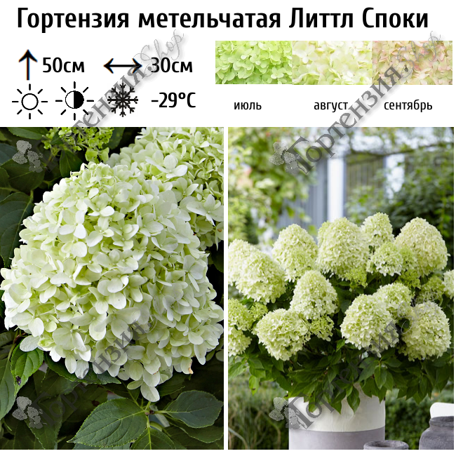 Гортензия метельчатая Литтл Споки (Little Spooky) - малышка, высотой до 50 см, и шириной кроны в пределах 30 см.Гортензия Little Spooky выделяется своими крупными метельчатыми соцветиями, достигающими до 25 см в длину. В начале цветения они имеют белый цвет, который со временем приобретает нежные розовые и лиловые оттенки.Цветение начинается в июле и продолжается до конца осени, обеспечивая длительный период наслаждения красотой этого растения.