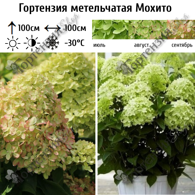 Гортензия метельчатая 'Moхито' — компактный куст, обильно и продолжительно цветущий. высотой до 1 м, и 1,2 м шириной. Цветки в соцветиях сначала бело-зеленые (освежающе салатовые), затем в конце лета более теплого слегка розоватого оттенка. Размер соцветий 20-25 см.Цветение с июля по сентябрь.