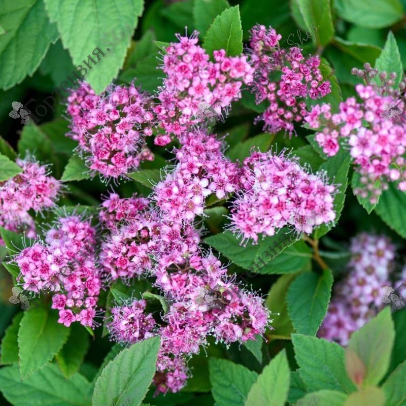 Спирея японская 'Manon' Spiraea japonica Manon Компактный кустарник высотой до 0,6–0,8 м с полушаровидной кроной диаметром до 0,8 м. Листья ланцетные, тёмно-зелёные, при распускании — с красноватым оттенком, осенью оранжево-красные. Цветёт обильно в VІІ–ІХ карминово-розовыми цветками, собранными в щитковидные соцветия до 3–4 см в диаметре.