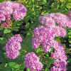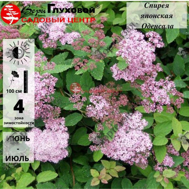 Спирея японская 'Odensala' Spiraea japonica Odensala Плотный густой кустарник с округлой кроной высотой и диаметром до 1 м. Листья крупные, сизовато-зелёные, осенняя окраска красивая, красно-коричневая. Побеги прямые, прочные, жёсткие, тёмно-бордовые. Цветки розовые, собраны в крупные щитковидные соцветия (VI–VІІ).