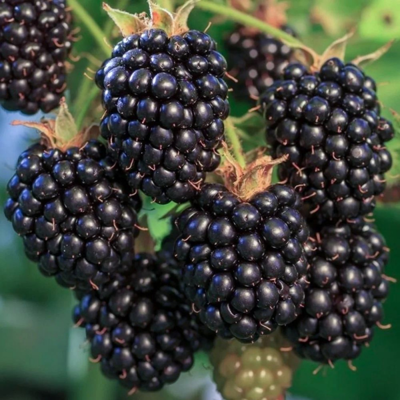 Ежевика Блэк Сатин (Black Satin) – неремонтантный сорт с ранним сроком созревания, относится к полустелющейся форме ежевики, до 6-7 метров. При должном уходе дает до 12-14 кг с одного куста.Ягоды округло-вытянутые, не особо крупные, весом до 6-8 грамм и собраны в кисти, по 13-16 штук в каждой. В стадии технической спелости — кисло-сладкие на вкус, при полноценном созревании становятся слаще и приобретают черный глянцевый блеск. низкая морозоустойчивость. Начинается плодоношение с конца июля или начала августа (в зависимости от региона) и длится до поздней осени.