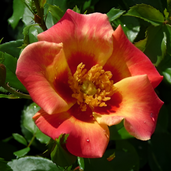 Роза миниатюрная 'Sunshine Babylon Eyes' (Rose miniature 'Sunshine Babylon Eyes') - Сорт серии 'Babylon Eyes'. Кустарник c компактной, плотной кроной, высотой до 60 см. Листья жесткие, блестящие. Цветение обильное, продолжительное с июня по октябрь. Цветы простые или полумахровые (4-8 лепестков), красный центр окружен желтой дугой, а края цветков снова красные, тычинки и пестик выделяются заметно. Роза устойчива к заморозкам, засухе и жаре. Почвы предпочитает плодородные, дренированные. Используются в одиночных и групповых посадках, как элемент живой изгороди.