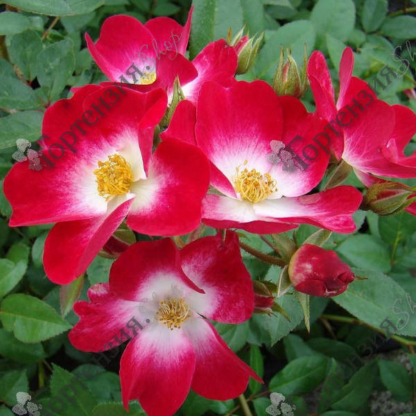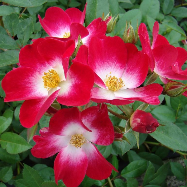 Роза мускусная 'Bukavu' (Rose Musk 'Bukavu') - Названная в честь города в Конго. Обильно цветущий кустарник, растет вертикально, высотой от 100 до 150 см. Листья темно-зеленые и блестящие. Цветы 5 см, красные с белыми серединками, простые (4-8 лепестков), собраны в крупные соцветия, с умеренным ванильным ароматом. Цветет волнами в течение всего сезона с июня. Осенью появляются небольшие, круглые, темно-красные плоды, которые привлекают птиц в ваш сад. Почвы предпочитает плодородные, дренированные. Благодаря своему яркому цвету он станет ярким акцентом на клумбе с розами, но может также привлекать всеобщее внимание и как отдельное растение и живая изгородь.