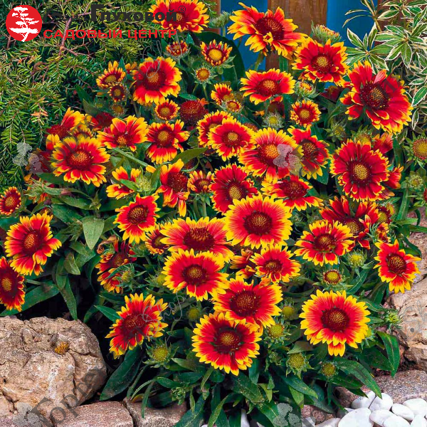 Гайллардия 'Аризона Сан'- компактный куст с серовато-зелёными листьями, цветки крупные, огненно-красные с ярко-жёлтыми краями и красным центром, высотой до 25 см.Цветение раннее.с мая по сентябрь.Подходит для срезки.