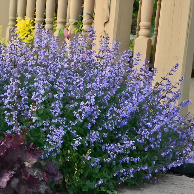 Котовник фассена 'Парсиан Блю' (Nepeta faassenii 'Purrsian Blue') Куст компактный, высота куста 30 см, шириной 30 см. Листья сердцевидные, зубчатые, зеленые, опушенные. Цветки крупные, трубчатые сине-фиолетовые в мутовчатых, соцветиях длиной до 10 см. Цветение очень долгое и обильное, с середины лета, на солнечном месте. Растение полностью ароматное. Очень хорошо подходит для выращивания в контейнерах. Почва лёгкая, дренированная.