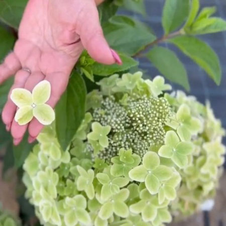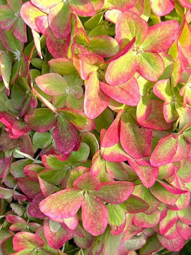 В начале цветения лепестки чистого лаймового цвета, далее постепенно образуется на стерильных цветках розовая кайма. В августе лаймовый цвет начинает преображаться в розовые оттенки, переходя в насыщенные яркие тона. С появлением контрастных ночных и дневных температур, лепестки приобретают малиново-бордовый оттенок с характерным металлическим оттенком.